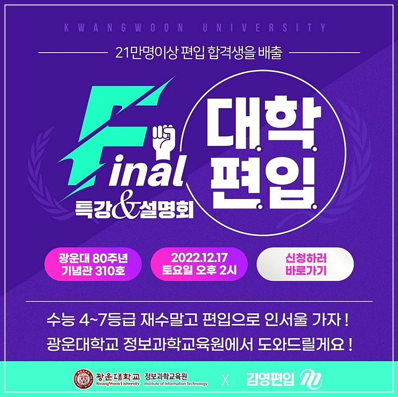 특히 광운대학교 대학원으로 진학하게 된다면 우선선발제도를 통해 수월한 진학이 가능하고