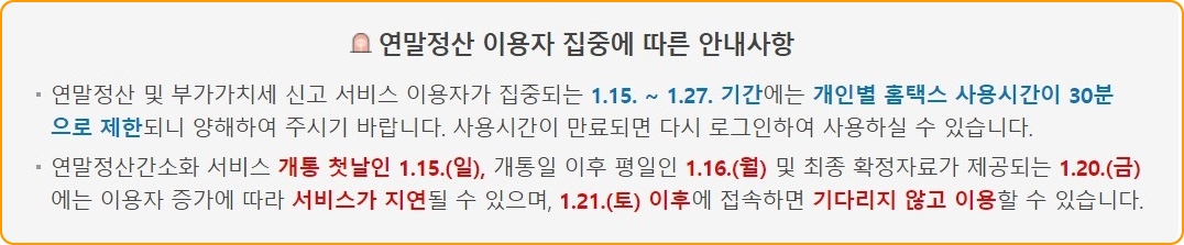 평소 홈택스를 사용하셨던 분들이시라면 홈택스 사이트 사용이 평소와 다르게 버벅거림을 느끼실 수 있을 것입니다. 단기간 안에 연말정산 간소화 서비스를 이용하기 위해서 몰리다 보니 그런 부분이니 넓은 마음을 가지고 진행하시면 좋을 거 같습니다. 또한 연말정산 간소화 신고 집중 기간인 23.01.15~23.01.27 까지는 PC 별 사용시간을 30분으로 제한되어 사용 가능합니다. 물론 30분을 사용하셨다고 하셔서 다시 홈택스를 접속 못하는 건 아니고 다시 로그인하시고 접속하셔서 사용하시면 됩니다.
