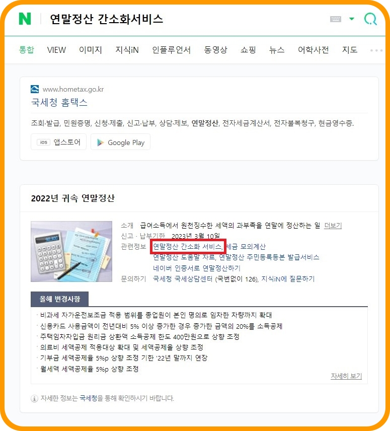 일단 연말정산 간소화 서비스 신청을 하려면 바로 홈택스로 들어가도 되지만!! 네이버에 연말정산 간소화 서비스라고 검색하시면 네이버에서 아주 친절하게 관련 정보를 보여주고 있습니다. 빨강색박스로 표시되어 있는 부분을 클릭하셔서 바로 연말정산 간소화 서비스진행이 가능합니다.