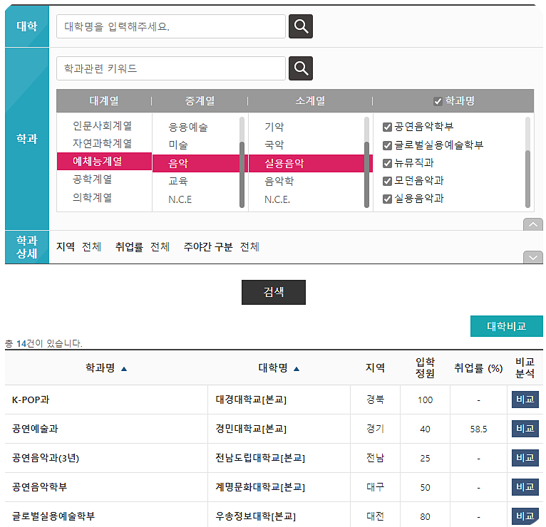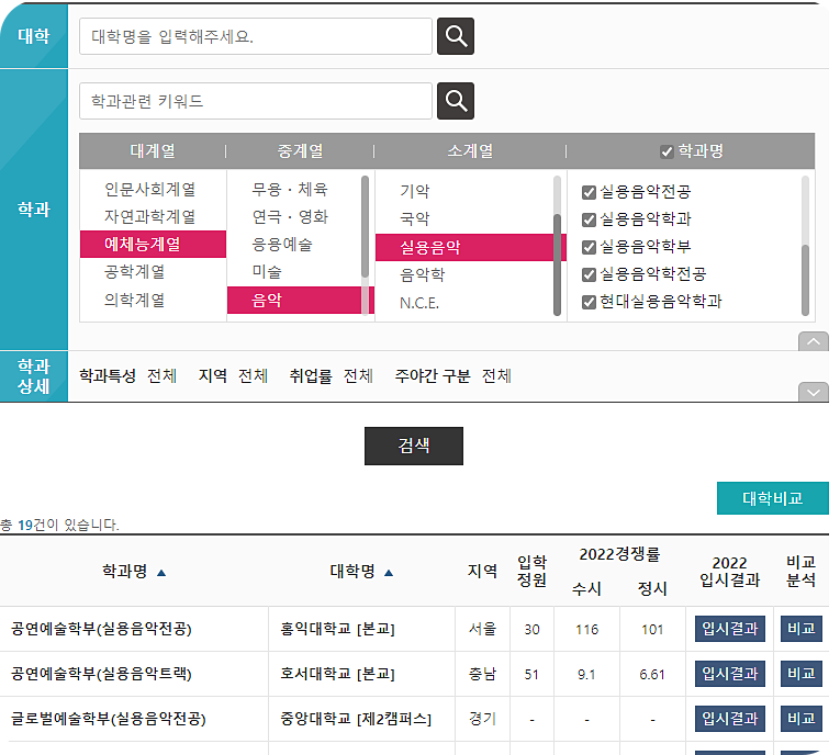 대학어디가에서는 실용음악학과로 필터링을 하면
