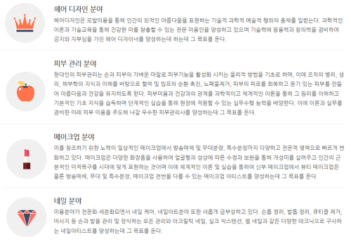 미용의 전반적인 분야(헤어미용, 피부미용, 메이크업, 네일아트, 분장 등)에 걸쳐