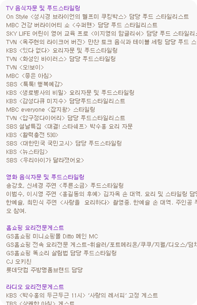 홍신애 교수는 스타 푸드스타일리스트로 불릴만큼 각종 TV, 홈쇼핑, 잡지 등에서