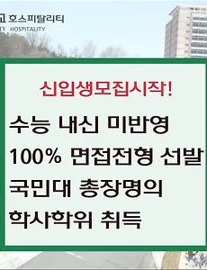 반응형 국민대학교 평생교육원1 국민대학교 평생교육원 알아보시나요~? 국민대학교 평생교육원 알아보시나요~? 수능/내신에 자신이 없는 학생들의 발길이 대학부설 평생교육원으로 옴겨지고 있습니다. 이유는 서울, 경기권 대학교 입학은 힘들고 지방대학은 가기싫은 학생들이 서울권에있는 평생교육원에 입학하여 학점을 취득하고 편입이나 대학원진학, 취업 및 창업 등의 다양한 입시전략을통해 본인이 원하고자 하는 목적을 이루려고 하기 때문이죠~ 그중 국민대학교 평생교육원을 알아보는 학생들이 많습니다. 국민대학교 총장명의 학사학위를 받을 수 있으며 실습위주의 수업을 진행하는 평생교육원으로 국민대학교 캠퍼스안에 위치해있으며 국민대학교 기숙사는 물론 통학버스, 동아리활동 등 대학 캠퍼스 생활을 할 수 있는 장점이 많은 학생들의 관심과 지원을 받고 있는것이죠~ 그중 국민대학교 평생교육원 호스피탈리티.. 2017. 7. 7. 이전 1 다음 반응형